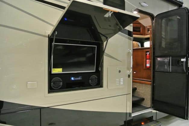 • Exterior Amenities: Outside Entertainment Center W/TV, AM/FM/CD/DVD & Sound bar, awning, pull-out Grill, and cooler.